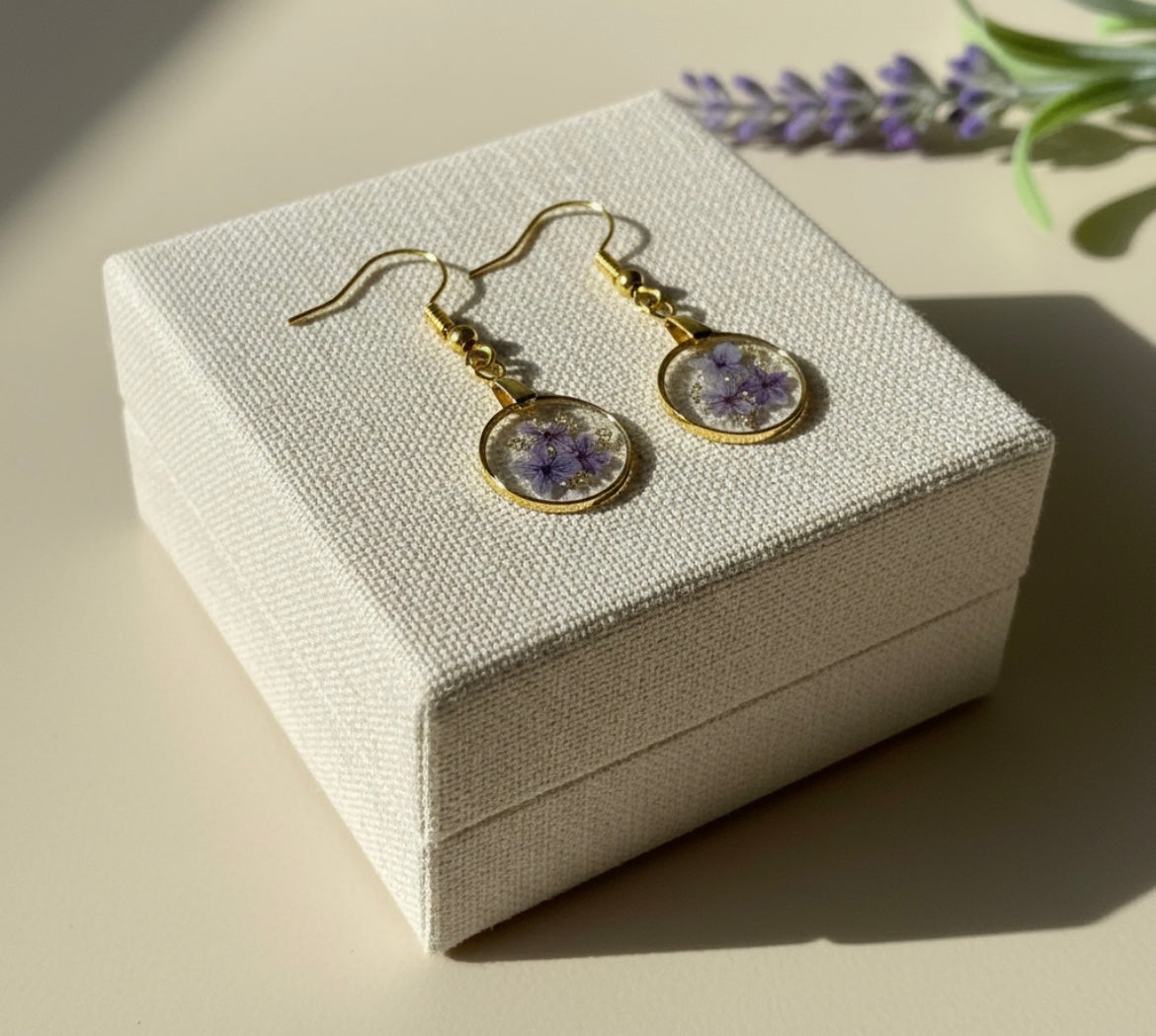 Ces boucles d'oreilles dorées en acier inoxydable renferme de magnifique fleurs violettes séchées avec de petits morceaux d'or.